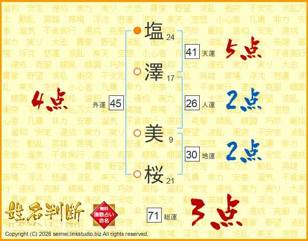 塩(24画)澤(17画) 美(9画)桜(21画)