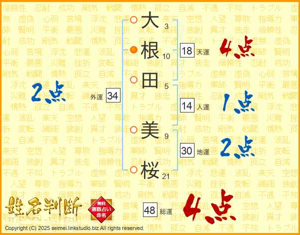 大(3画)根(10画)田(5画) 美(9画)桜(21画)