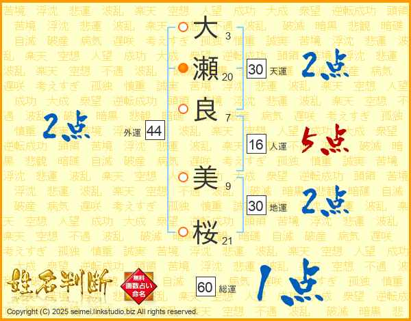 大(3画)瀬(20画)良(7画) 美(9画)桜(21画)