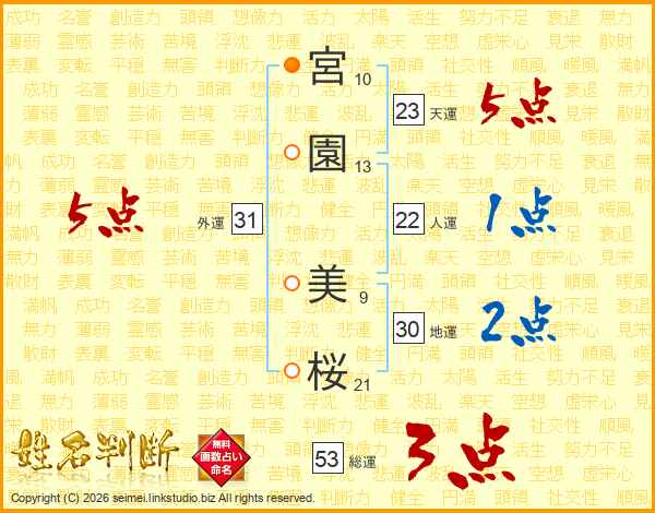 宮(10画)園(13画) 美(9画)桜(21画)