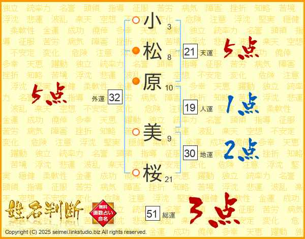 小(3画)松(8画)原(10画) 美(9画)桜(21画)
