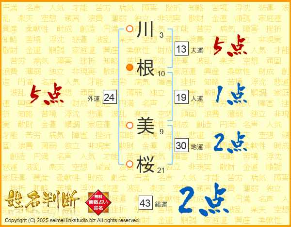 生活面を象徴する運勢です。外部から受ける影響力を表し、結婚運、家庭運や職場、環境への順応性を表します。総運から人運を引いた画数。姓や名が1文字の場合を除く。