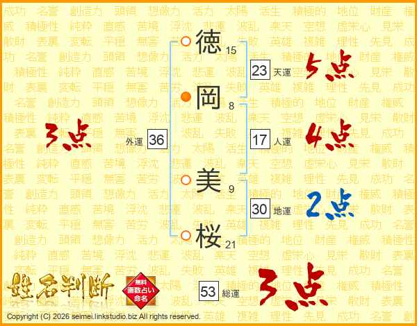 徳(15画)岡(8画) 美(9画)桜(21画)