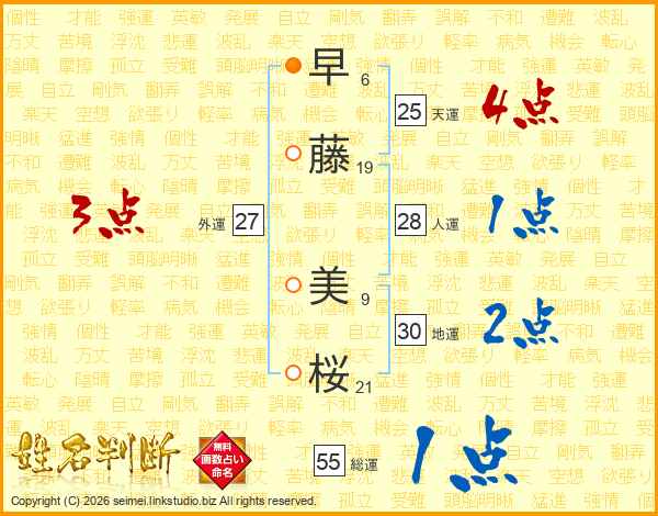 早(6画)藤(19画) 美(9画)桜(21画)