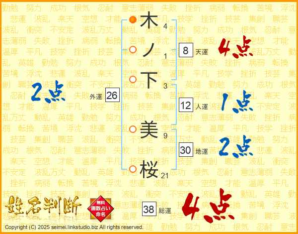 木(4画)ノ(1画)下(3画) 美(9画)桜(21画)