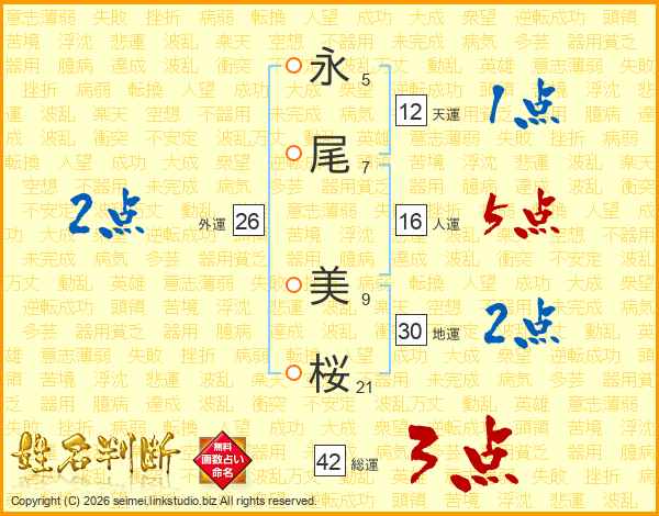 生活面を象徴する運勢です。外部から受ける影響力を表し、結婚運、家庭運や職場、環境への順応性を表します。総運から人運を引いた画数。姓や名が1文字の場合を除く。