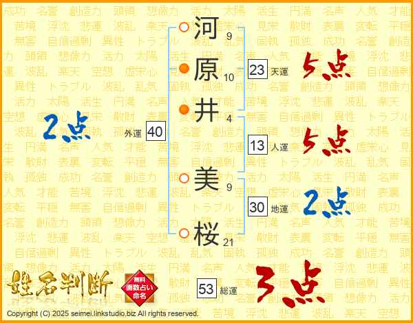 河(9画)原(10画)井(4画) 美(9画)桜(21画)