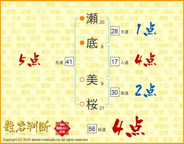 瀬(20画)底(8画) 美(9画)桜(21画)