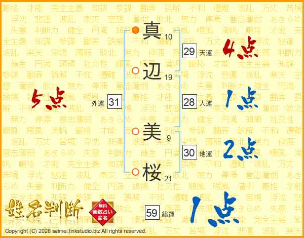 真(10画)辺(19画) 美(9画)桜(21画)