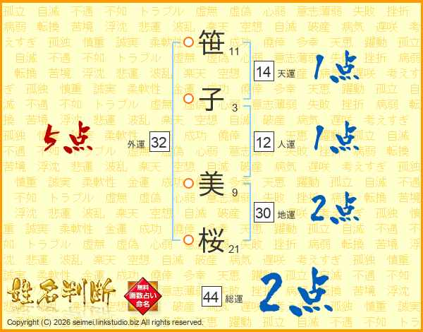 笹(11画)子(3画) 美(9画)桜(21画)