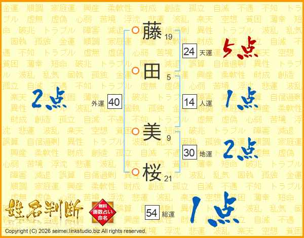 生活面を象徴する運勢です。外部から受ける影響力を表し、結婚運、家庭運や職場、環境への順応性を表します。総運から人運を引いた画数。姓や名が1文字の場合を除く。