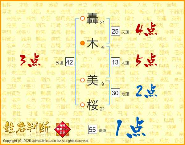 あなたの人生を表す1番重要な運勢です。生涯を通じて影響する総合運となり、主に50歳以降の晩年期に影響を及ぼします。苗字と名前の合計画数。