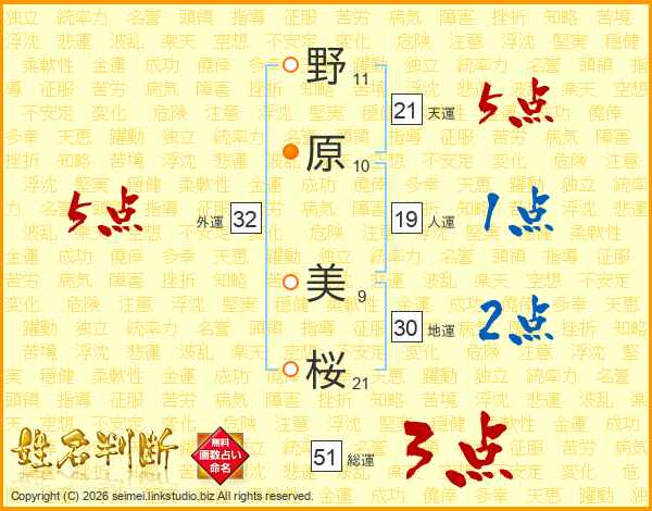 野原美桜さんの外運は32画の5点!