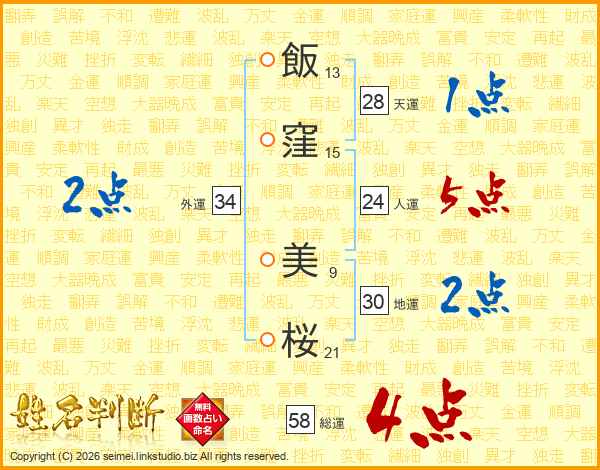 飯(13画)窪(15画) 美(9画)桜(21画)