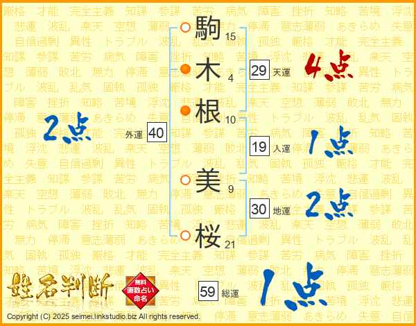 駒(15画)木(4画)根(10画) 美(9画)桜(21画)