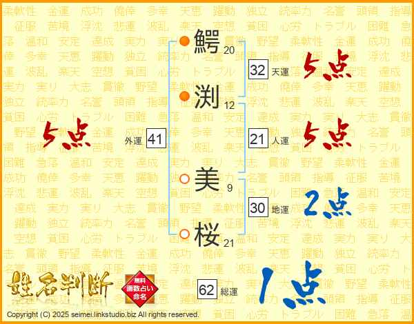 鰐渕美桜さんの天運は32画の5点!