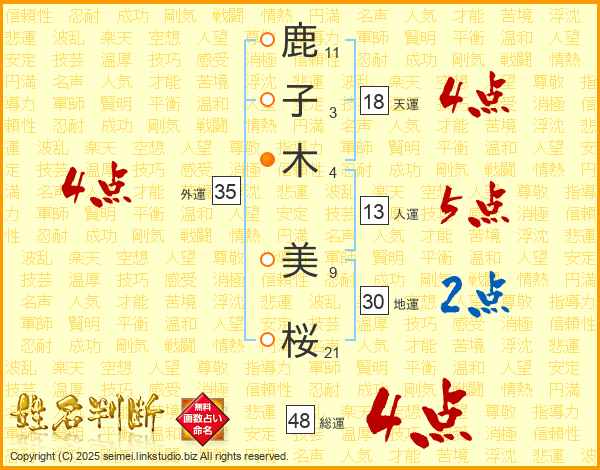 鹿(11画)子(3画)木(4画) 美(9画)桜(21画)