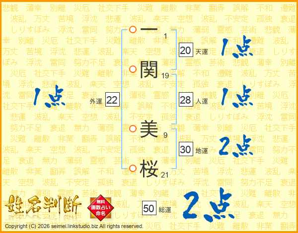 生活面を象徴する運勢です。外部から受ける影響力を表し、結婚運、家庭運や職場、環境への順応性を表します。総運から人運を引いた画数。姓や名が1文字の場合を除く。