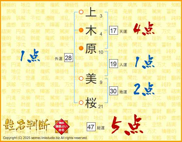 上(3画)木(4画)原(10画)  美(9画)桜(21画)