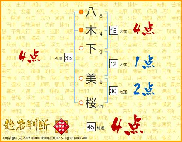 八(8画)木(4画)下(3画) 美(9画)桜(21画)