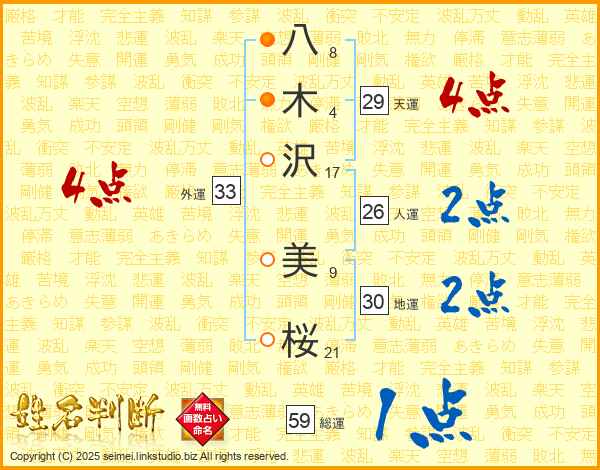 八(8画)木(4画)沢(17画) 美(9画)桜(21画)