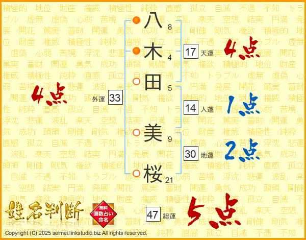 八(8画)木(4画)田(5画) 美(9画)桜(21画)