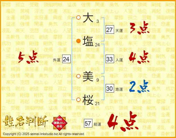 生活面を象徴する運勢です。外部から受ける影響力を表し、結婚運、家庭運や職場、環境への順応性を表します。総運から人運を引いた画数。姓や名が1文字の場合を除く。