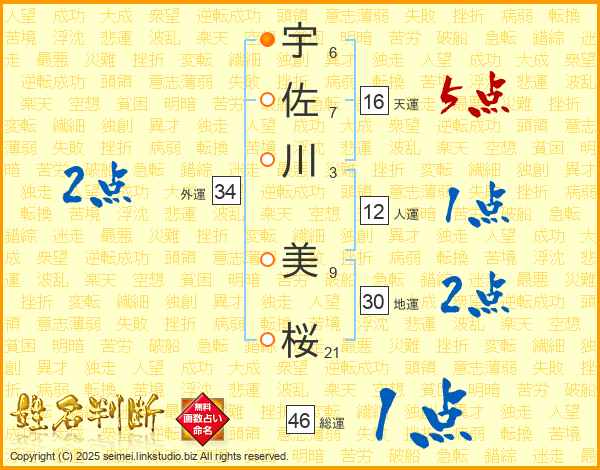 宇(6画)佐(7画)川(3画) 美(9画)桜(21画)