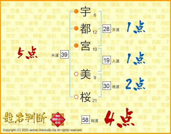 宇(6画)都(12画)宮(10画) 美(9画)桜(21画)