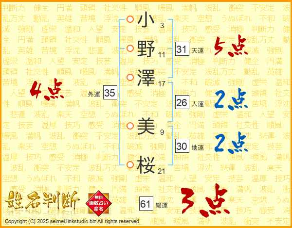 小(3画)野(11画)澤(17画) 美(9画)桜(21画)