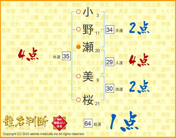小(3画)野(11画)瀬(20画) 美(9画)桜(21画)