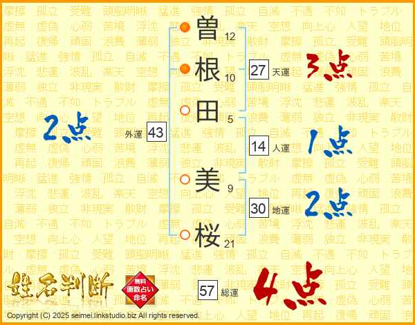 曽(12画)根(10画)田(5画)  美(9画)桜(21画)