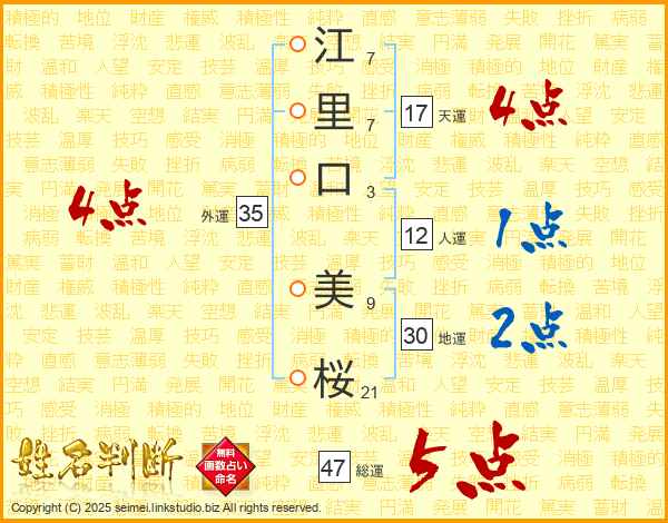 江(7画)里(7画)口(3画) 美(9画)桜(21画)
