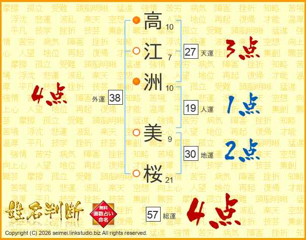 高(10画)江(7画)洲(10画) 美(9画)桜(21画)