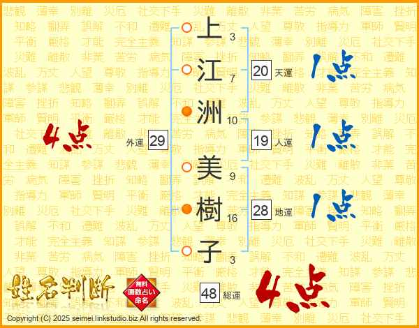上(3画)江(7画)洲(10画) 美(9画)樹(16画)子(3画)