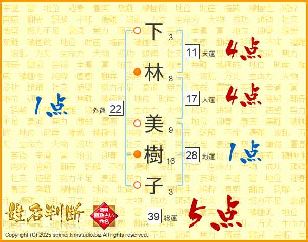 下(3画)林(8画) 美(9画)樹(16画)子(3画)