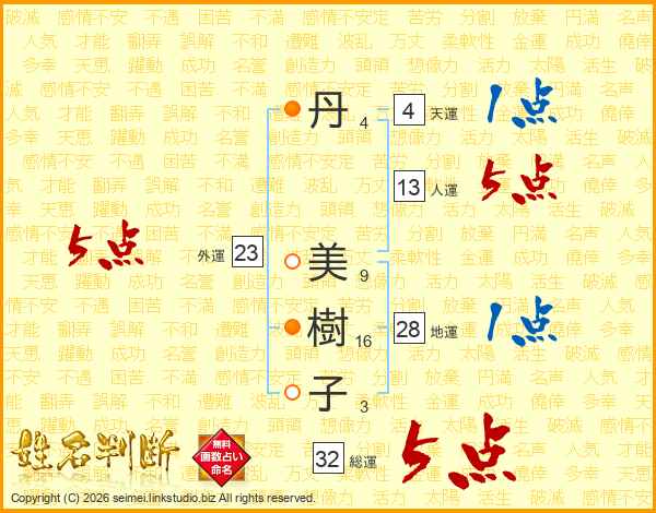 丹(4画) 美(9画)樹(16画)子(3画)