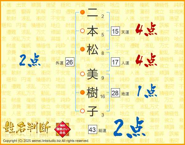 二(2画)本(5画)松(8画) 美(9画)樹(16画)子(3画)