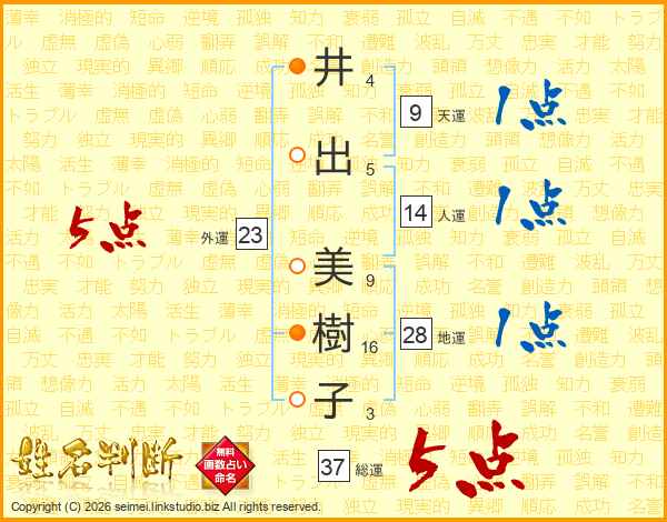 井(4画)出(5画) 美(9画)樹(16画)子(3画)