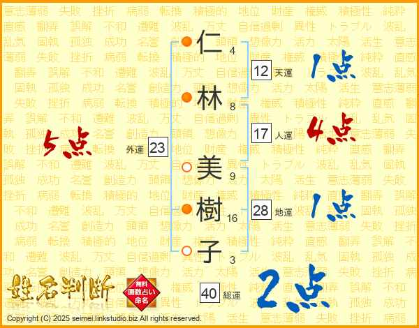 仁(4画)林(8画) 美(9画)樹(16画)子(3画)