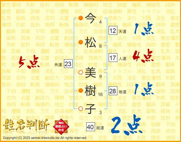 今(4画)松(8画) 美(9画)樹(16画)子(3画)