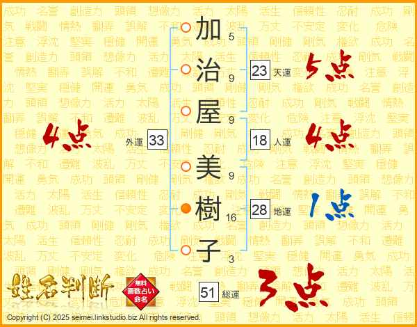 加(5画)治(9画)屋(9画) 美(9画)樹(16画)子(3画)