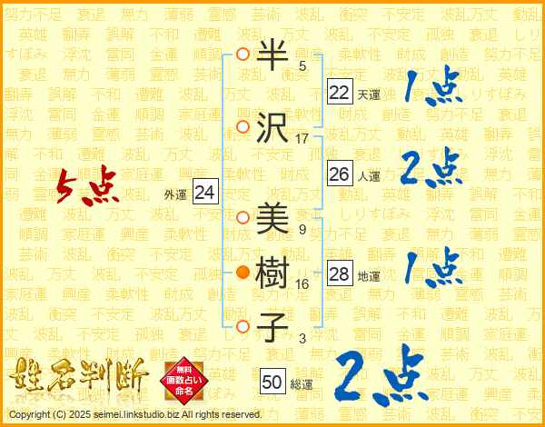 半(5画)沢(17画) 美(9画)樹(16画)子(3画)