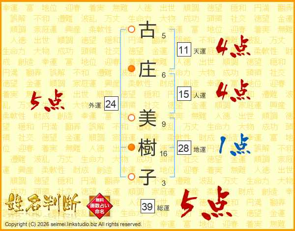 古(5画)庄(6画) 美(9画)樹(16画)子(3画)