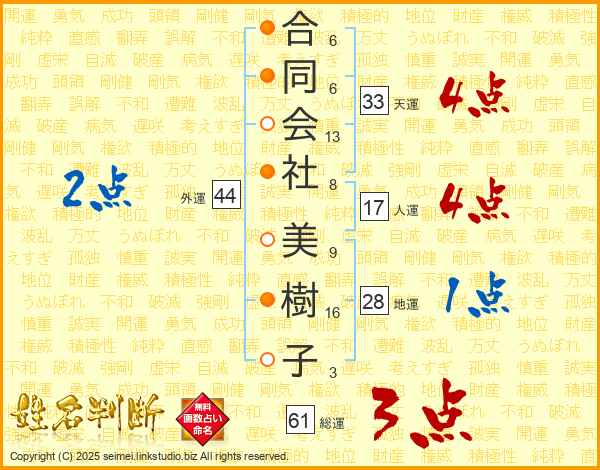 合(6画)同(6画)会(13画)社(8画)  美(9画)樹(16画)子(3画)