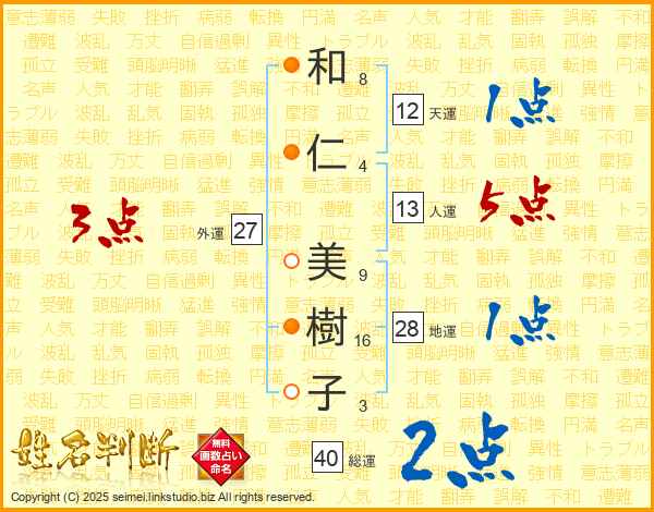 和(8画)仁(4画) 美(9画)樹(16画)子(3画)