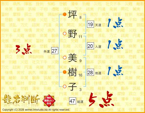 坪(8画)野(11画) 美(9画)樹(16画)子(3画)
