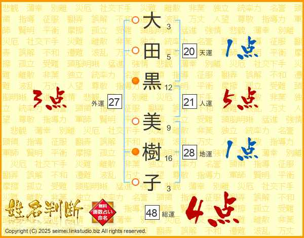 大(3画)田(5画)黒(12画) 美(9画)樹(16画)子(3画)