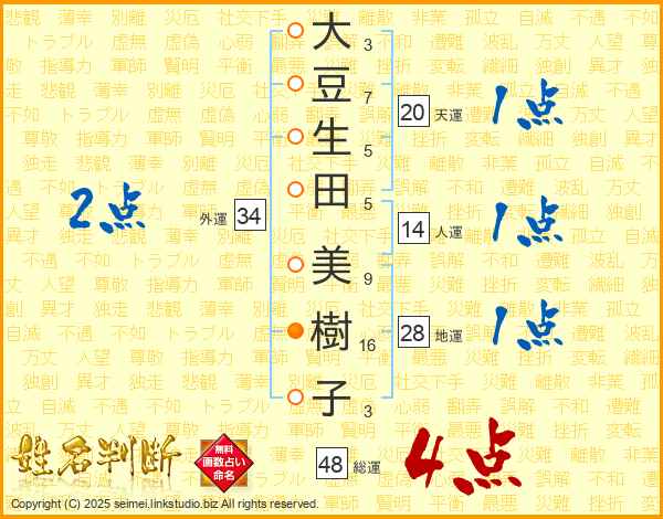 大(3画)豆(7画)生(5画)田(5画) 美(9画)樹(16画)子(3画)