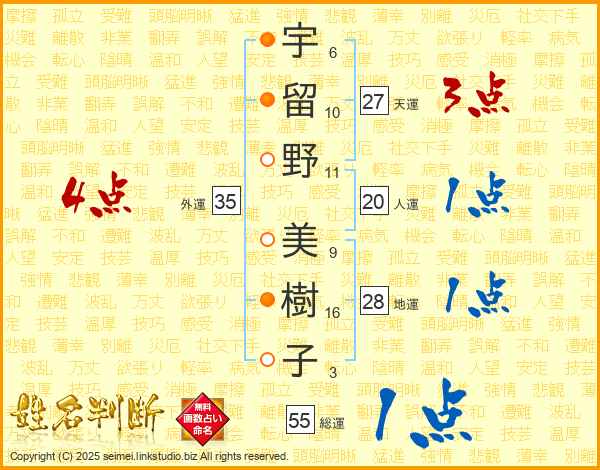 宇(6画)留(10画)野(11画) 美(9画)樹(16画)子(3画)